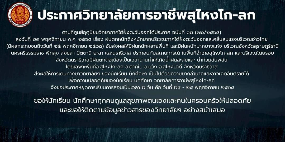 ตามที่ศูนย์อุตุนิยมวิทยาภาคใต้ฝั่งตะวันออกได้ประกาศ ฉบับที่ ๑๒ (๗๐/๒๕๖๘) ลงวันที่ ๒๓ พฤศจิกายน พ.ศ. ๒๕๖๘ เรื่อง ฝนตกหนักถึงหนักมากบริเวณภาคใต้ฝั่งตะวันออกและคลื่นลมแรงบริเวณอ่าวไทย (มีผลกระทบจนถึงวันที่ ๒๕ พฤศจิกายน ๒๕๖๘) อันส่งผลให้มีฝนหนักหลายพื้นที่ และมีฝนหนักมากบางแห่ง บริเวณจังหวัดสุราษฎร์ธานี นครศรีธรรมราช พัทลุง สงขลา ปัตตานี ยะลา และนราธิวาส ประกอบกับสถานการณ์ ในพื้นที่อำเภอสุไหงโก-ลก และบริเวณโดยรอบจังหวัดนราธิวาสมีฝนตกต่อเนื่องเป็นเวลานานทำให้เกิดน้ำฝนสะสมและ น้ำท่วมฉับพลัน โดยเฉพาะพื้นที่อ.สุไหงโก-ลก อ.ตากใบ อ.แว้ง อ.สุไหงปาดี จังหวัดนราธิวาส ส่งผลให้การเดินทางมาวิทยาลัยฯ ของนักเรียน นักศึกษา เป็นไปด้วยความยากลำบากและอาจเกิดอันตรายได้ เพื่อความปลอดภัยของนักเรียน นักศึกษา วิทยาลัยการอาชีพสุไหงโก-ลก จึงขอประกาศหยุดการเรียนการสอนเป็นเวลา ๒ วัน คือ วันที่ ๒๔ - ๒๕ พฤศจิกายน ๒๕๖๘